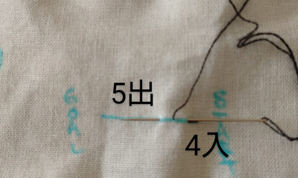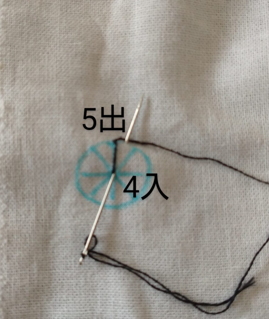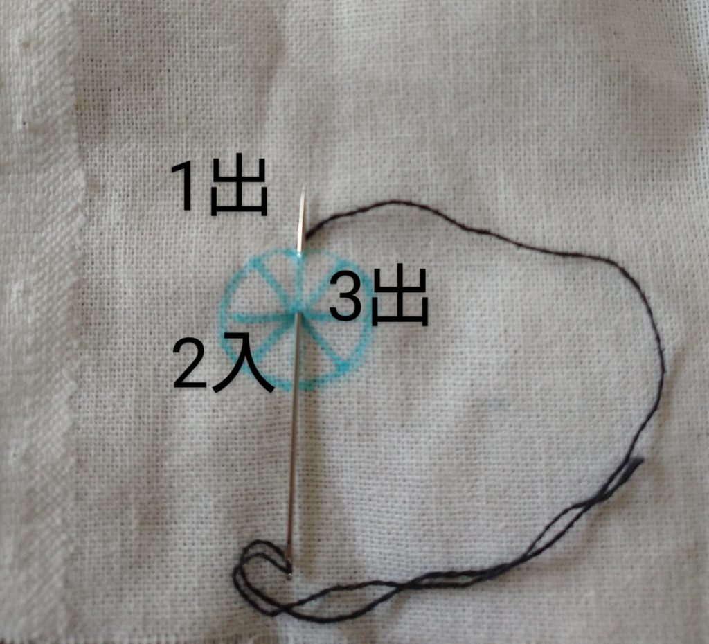 最初に針を出したところから少しずらして針を出します。この時、糸は針にかけるようにします。(3出)