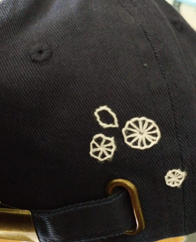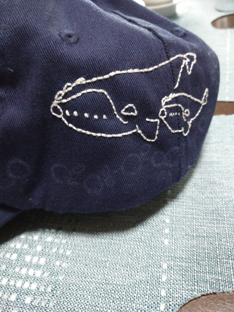 バックステッチのクジラとブランケットステッチのお花で夏っぽい帽子にアレンジしてみました。